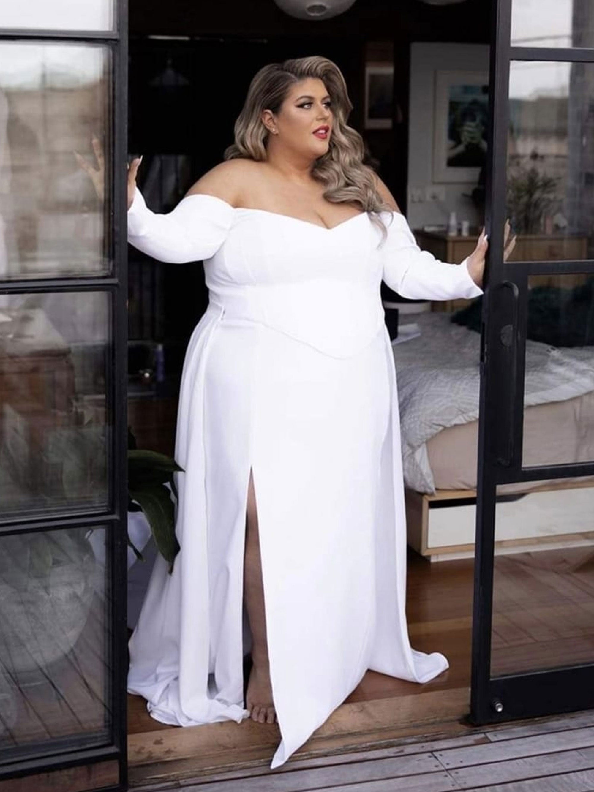 This fully fitted and boned bodice with split skirt, was made with a luxurious Japanese Crepe in White. Finished off with a 4 Metre Cathedral Train, This gown was the epitome of old world glamour meets modern chic