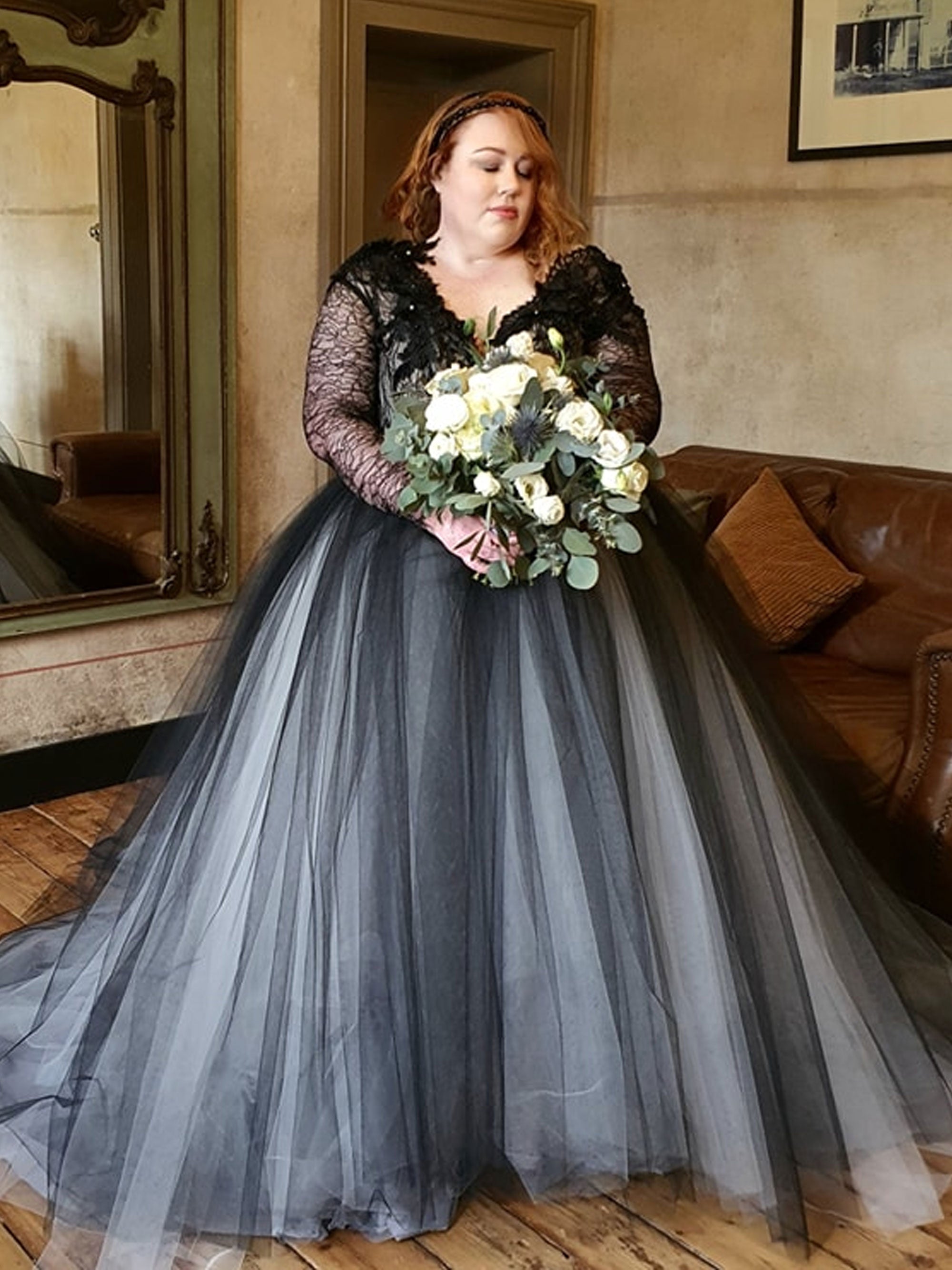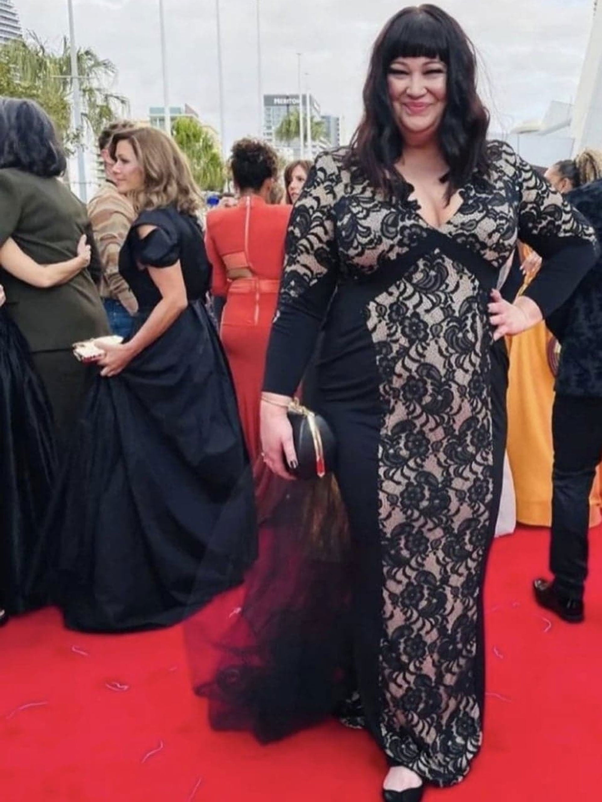 This incredible Black and lace fitted gown was created for Katrina Milosevic who plays Boomer on the Foxtel series, Wentworth. This gown was detailed with hand cut lace panelling and a detachable tulle train to create this dramatic and ever so luxurious piece.